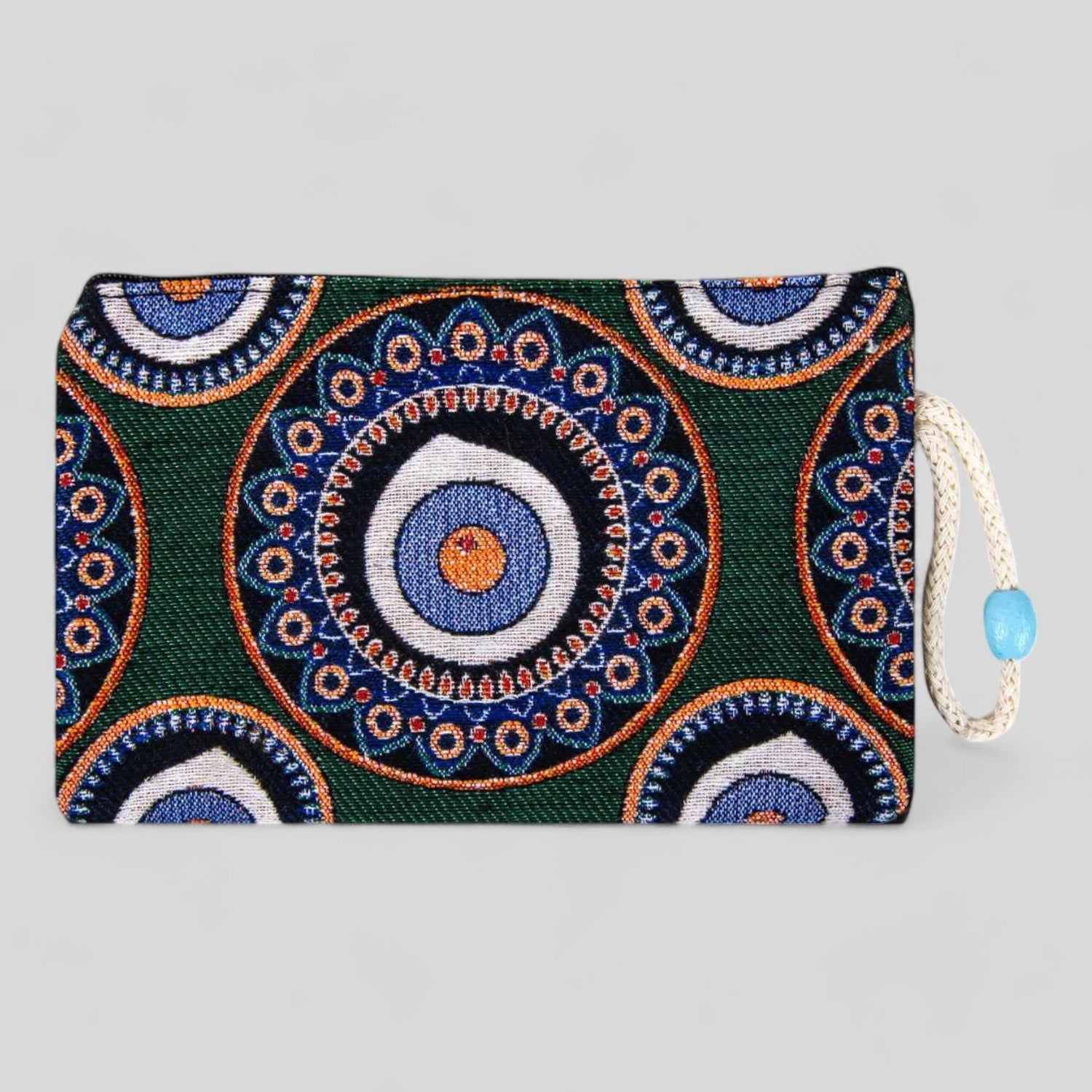 This is an authentic handmade Turkish handheld purse that is perfect for storing your keys, jewelry, and other small items. Handcrafted in Turkey, this traditional design features a beautiful green evil eye mandala design on the front and the back. It is made from woven fabric with stitched designs, has a zipper to open and close it, and a convenient small strap to hang or hold onto.