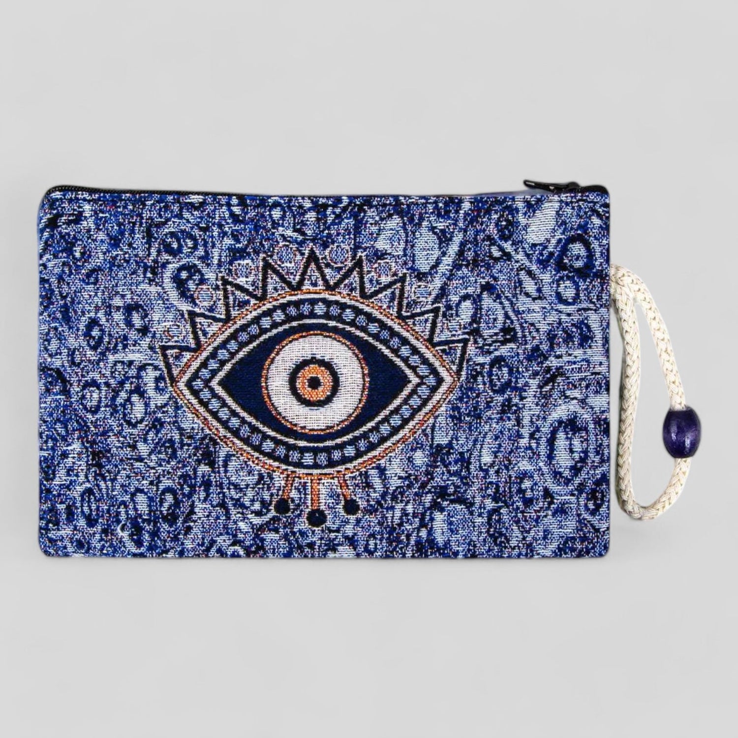 This is an authentic handmade Turkish handheld purse that is perfect for storing your keys, jewelry, and other small items. Handcrafted in Turkey, this traditional design features a beautiful Blue Evil Eye design on the front and the back. It is made from woven fabric with stitched designs, has a zipper to open and close it, and a convenient small strap to hang or hold onto.